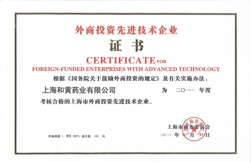 根据《国务院关于鼓励外商投资的规定》及有关实施办法,经上海市商务委员会及有关专家一致认定,上海和黄药业有限公司为2011年度考核合格的上海市外商投资先进技术企业。