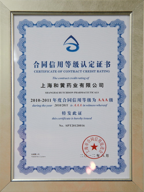 近日,上海和黄药业凭借良好的信誉荣获“上海市守合同重信用企业”称号,合同信用等级被认定为AAA级,属最高级别。