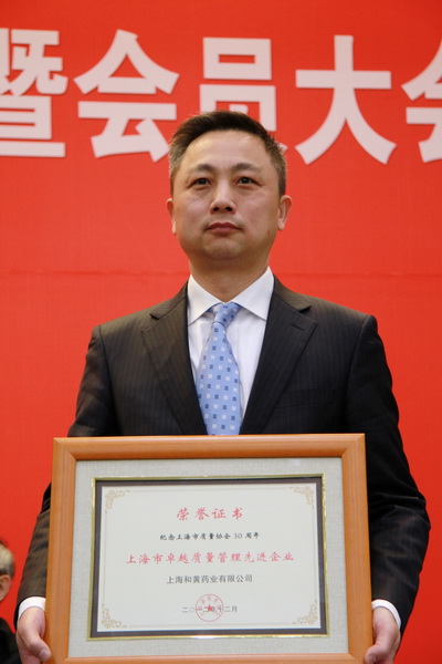 12月12日,上海市质量协会成立30周年纪念大会暨会员大会在市政协礼堂隆重召开。会上授予上海和黄药业“上海市卓越质量管理先进企业”称号,公司总经理周俊杰应邀参加大会并上台领奖。