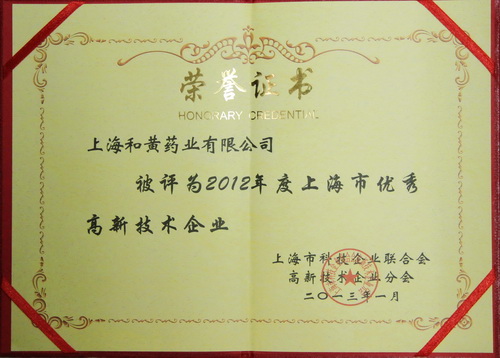 近日,上海和黄药业被评为2012年度“上海市优秀高新技术企业”。这是上海市科技企业联合会首次组织开展的该项评审,由上海市高新技术企业认定办公室给予指导,在全市高新技术企业中经过提名、遴选、申报、评审,公示,上海和黄药业被最终确定为全市100家优秀高新技术企业之一。