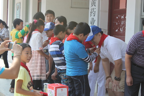 回访捐赠仪式上,少先队员为我们系上红领巾