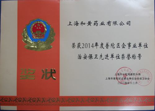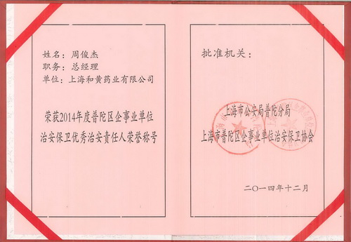 日前,经上海市公安局普陀分局、上海市普陀区企事业单位治安保卫协会批准,上海和黄药业有限公司荣获“2014年度上海市普陀区企事业单位治安保卫先进单位”称号,公司总经理周俊杰荣获“2014年度上海市普陀区企事业单位治安保卫优秀治安责任人”称号。