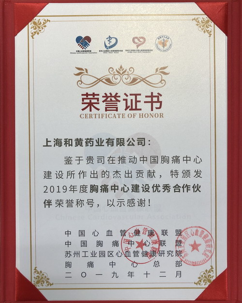 ——上海和黄药业荣获“2019年度胸痛中心建设优秀合作伙伴”称号