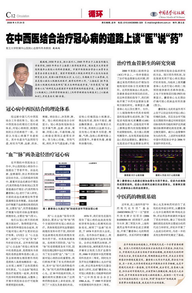 用“心主血脉”指导中西医结合,要求从“血”和“脉”两个方面同时研究冠心病的治疗。具体体现在研究血管壁的病理改变和中药干预,同时研究血液理化性质的病理改变和中药干预。对具体病理来说,在疾病不同阶段,“血”与“脉”的受损程度各有不同,因而在处理过程中也应有所侧重。为了充分说明“血”、“脉”二方面对冠心病防治的重要性,我们积极开展了有关药物的研究,其中“血”的代表药物是丹参,“脉”的代表药物是麝香保心丸。近30年的临床实践,大量的病例反馈都反映了这两种药物在临床上卓有成效,受到了广大医生及患者的欢迎。